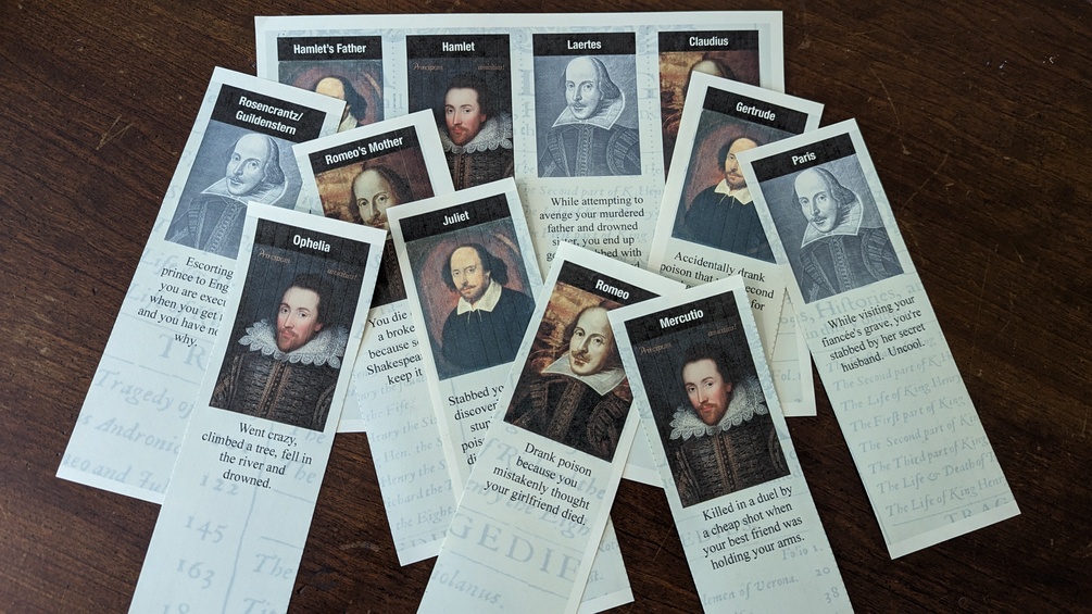 When I go into classrooms to talk about Shakespeare, I like to bring something for the students to remember. That's where the idea of bookmarks came from. It's easy to print as many as you need. They're a guaranteed conversation starter and also educational! Students will no doubt recognize those plays they've read, but if you didn't know somebody exits pursued by a bear or gets baked into a pie (and fed to his mother!), it's definitely going to get your curiosity up.